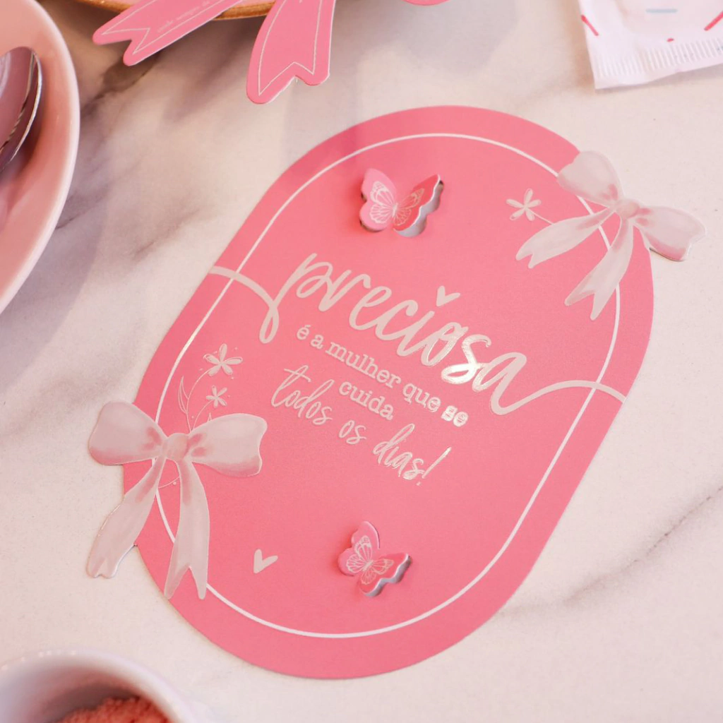 Papel: Couchê 300g com acabamento em verniz localizado na frente, corte oval e corte nas borboletas