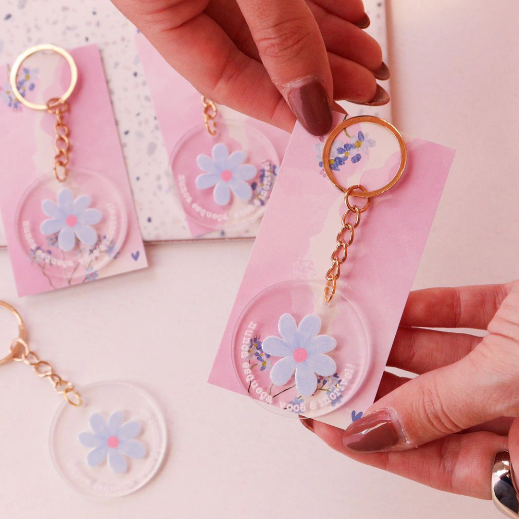 Chaveiro incrível com uma frase especial para sua cliente.